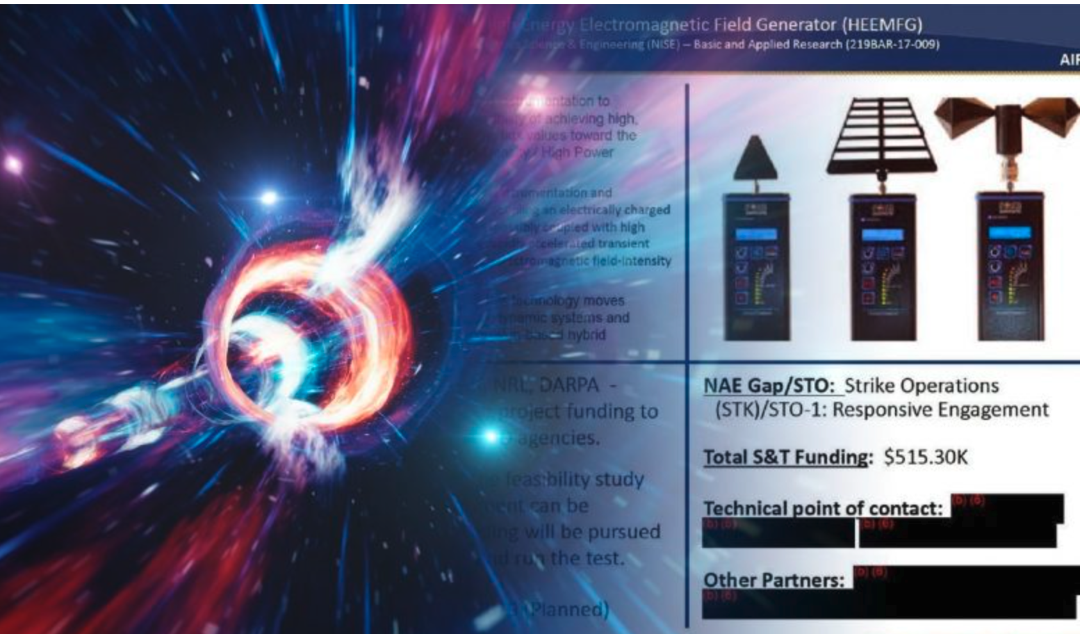 Vários documentos vem sugerindo que um departamento de armas de guerra da Marinha Americana (NAWCAD) estão testando conceitos de tecnologias que sugerem uma patente de objeto voador com um sistema de propulsão jamais visto. Revelados pelo Engenheiro Aeroespacial Dr Salvatore Cezar Pais, as tecnologias referidas são supercondutores em altíssimas temperatura, um gerador de campos eletromagnéticos (tipo um campo de força), um gerador de ondas gravitacionais de alta frequencia e um dispositivo de fusão em plasma com altíssima compressão.. Entre diversos outros. Existem relatórios de cerca de 1600 horas de trabalho nesse projeto entre 2018 e 2019. E o mais interessante é uma espécia de arma que modifica o espáco e tempo que faz uma bomba nuclear parecer uma bombinha de festa junina. Vamos ver as próximas iterações sobre isso. Provavelmente devem ser soltadas novas informações na imprensa logo logo.