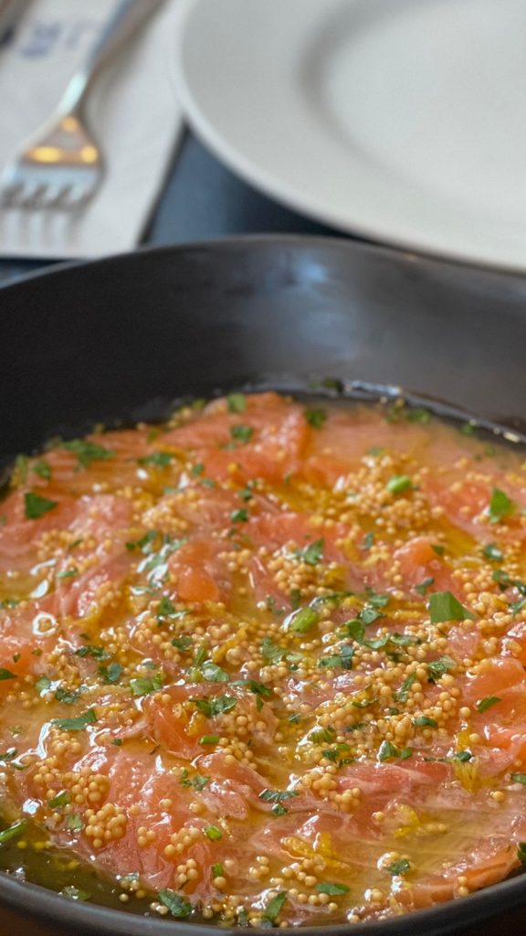 Tiradito de Salmão com azeite trufado, sementes de mostarda e limão.