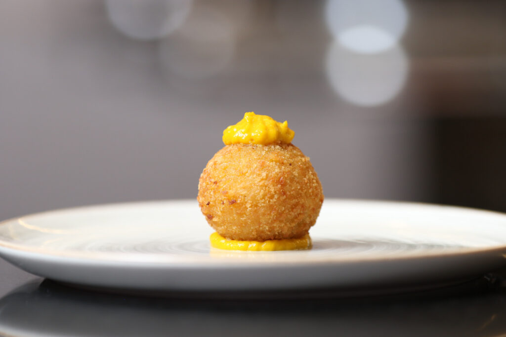 Para revelar a Cor do Ano Suvinil, a Só Reparo convidou a coluna À Mesa com exclusividade. O evento contou com um menu especial do ex-masterchef Vinicius Rossignoli, onde ele realizava invenções gastronômicas e molhos de acordo com as paletas apresentadas pela marca de tintas. O menu contou com uma coxinha especial com molhos de maionese ao leite e vinho reduzido no bacon e pior de cassis (foto). De prato principal, os convidados puderam desfrutar do cupim maturado em 18 horas com abóbora, molho de laranja e cebola empanada. Uma explosão de cores e sabores.