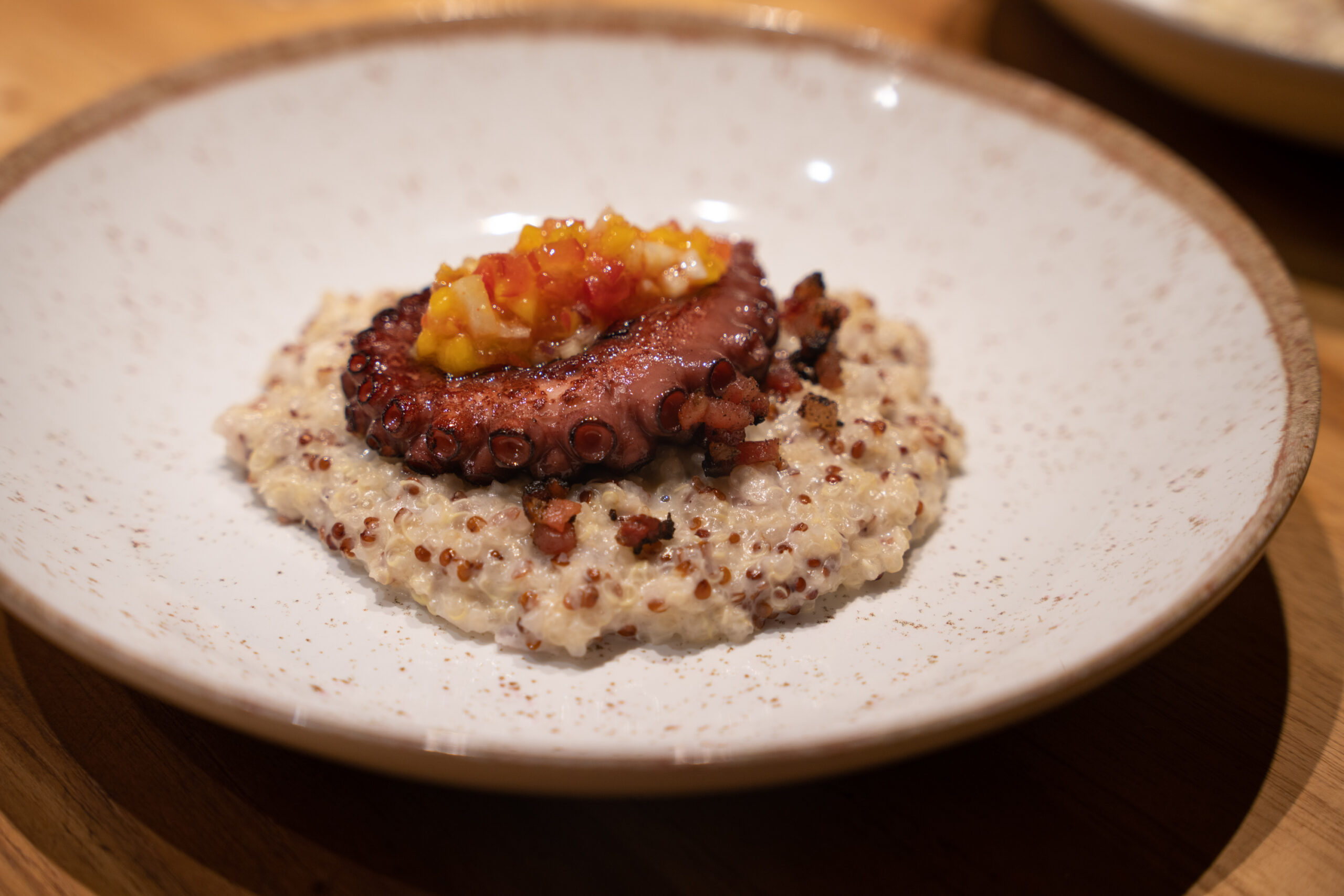 A coluna à Mesa, com exclusividade, conseguiu provar esse menu espetacular. São nove etapas surreais, onde é impossível destacar algum item. Porém, a criatividade de Paulo atingiu um nível inexplorado em Brasília com o preparo de Polvo com risoto de quinoa finalizado com manga e abacaxi (foto). Para quem quer provar este menu de outro mundo do chef, as reservas de agosto e setembro já estão disponíveis. Em agosto, nos dias 11, 12, 18, 19 e 25 e 26; em setembro, nos dias 1, 2, 21, 22, 28, 29 e 30. Para fazer sua reserva, acesse: https://tarso.meitre.com/