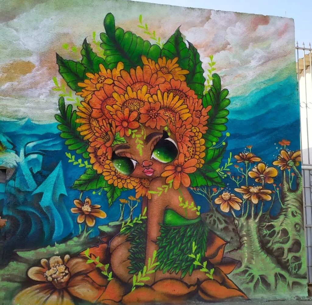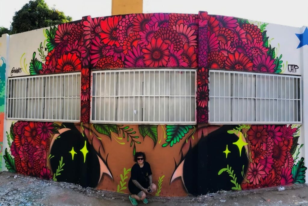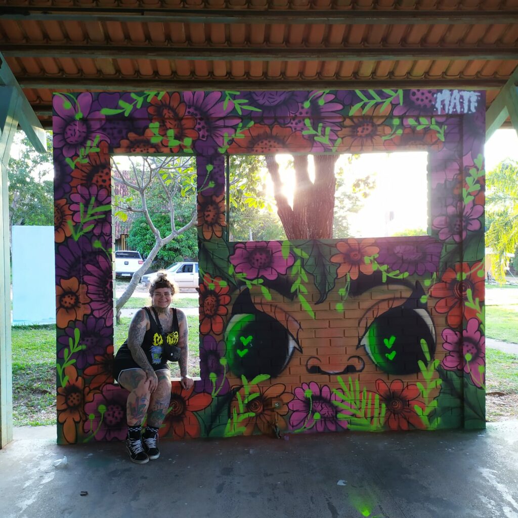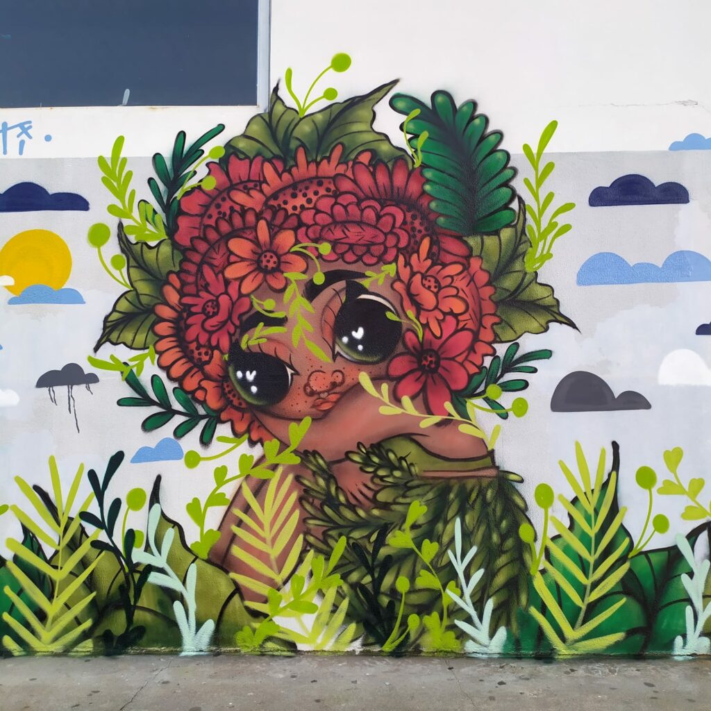 Naiana Alves, ou simplesmente Nati (@naiananatti), como é conhecida no grafite, começou a pintar as ruas em 2006, sendo uma das primeiras mulheres do estilo no Distrito Federal. Hoje, acumula 17 anos de intensa atuação artística. Sua grande marca, as “meninas flores”, tem grandes olhos expressivos, muitas cores vibrantes, além de elementos orgânicos, que empoderam o feminino e a natureza que colorem muros, paradas e muitos outros lugares do DF e de outros estados brasileiros.