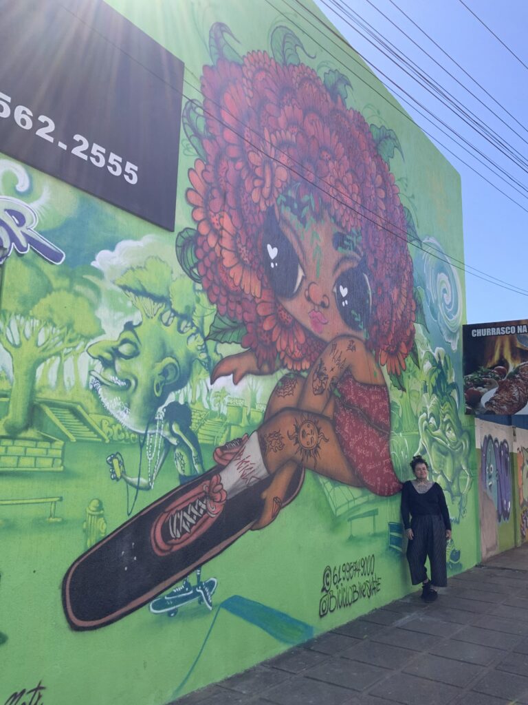 A cena do DF eu sempre achei muito rica, hoje continua sendo muito bem representada. Fico feliz em ver a cada dia mais pessoas fazendo grafite, principalmente mulheres, acho que quando outras mulheres veem grafite de mulheres na rua, isso motiva a mais mulheres irem para as ruas. Criamos uma identificação e vemos que podemos estar na rua também. Cada uma de nós pode ser referência.