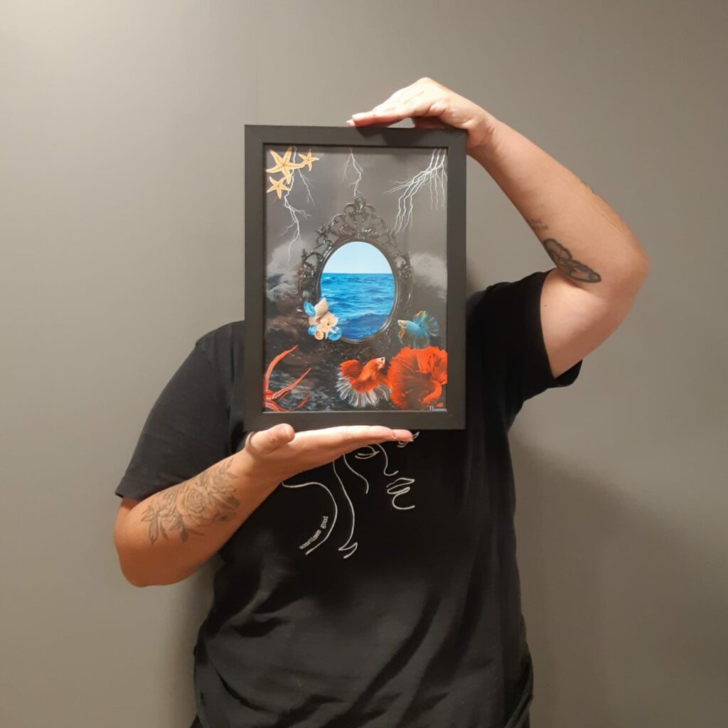 A colagem surgiu, de fato, durante a pandemia. Foi em um momento de muitas dúvidas e angústias que me vi ali, procurando formas de preencher alguns vazios. Comecei pela colagem digital mesmo, criando artes para presentear meus amigos. Fui criando, criando, criando, até que cheguei no momento de compartilhar essas criações com o mundo. A ideia inicial era apenas compartilhar, mesmo. Até que chegou uma encomenda (de uma pessoa totalmente desconhecida pra mim) e, mesmo com muito receio e dúvida sobre essas criações, aceitei o desafio e percebi, durante aquele processo, que poderia nascer uma nova carreira.