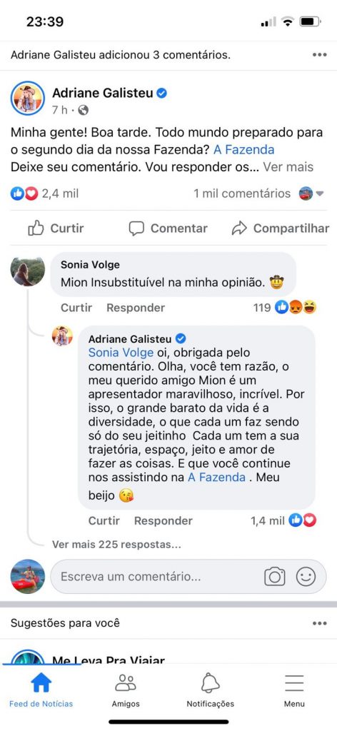 Logo, Adriane Galisteu resolveu responder o comentário da seguidora saudosa de Mion: “Oi, obrigada pelo comentário. Olha, você tem razão, o meu querido amigo Mion é um apresentador maravilhoso, incrível. Por isso, o grande barato da vida é a diversidade, o que cada um faz sendo só do seu jeitinho. Cada um tem sua trajetória, espaço, jeito e amor de fazer as coisas. E que você continue nos assistindo na A Fazenda. Meu beijo.”