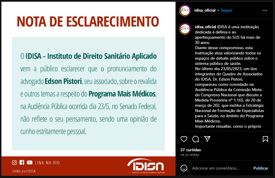 “IDISA é uma instituição dedicada à defesa e ao aperfeiçoamento do SUS há mais de 30 anos. Diante desse compromisso, esta Instituição atua valorizando todos os espaços de debate público sobre o sistema público de saúde. No último dia 23/05/2023, um dos integrantes do Quadro de Associados do IDISA, Dr. Edson Pistori, compareceu como convidado na Audiência Pública da Comissão Mista do Congresso Nacional que discute a Medida Provisória nº 1.165, de 20 de março de 202, que institui a Estratégia Nacional de Formação de Especialistas para a Saúde, no âmbito do Programa Mais Médicos. Importante ressaltar, como o próprio Dr. Edson já manifestou publicamente, que suas opiniões são resultado dos seus estudos e não refletem a posição institucional do IDISA. As críticas ao Revalida fazem parte do debate público sobre esse mecanismo e não há quaisquer indícios ou perspectivas de que esse instrumento venha a ser ampliado para outras carreiras profissionais. Por isso, ainda que a declaração possa ter sido feita como mero recurso de argumentação, ela não reflete, sob nenhuma hipótese, o entendimento do IDISA. Quanto ao debate da carreira nacional para médicos, a posição do IDISA tem sido pela impossibilidade jurídica dessa modelagem uma vez que o regime federativo do país e a própria repartição de competências do SUS para o Entes federativos veda essa possibilidade”.
