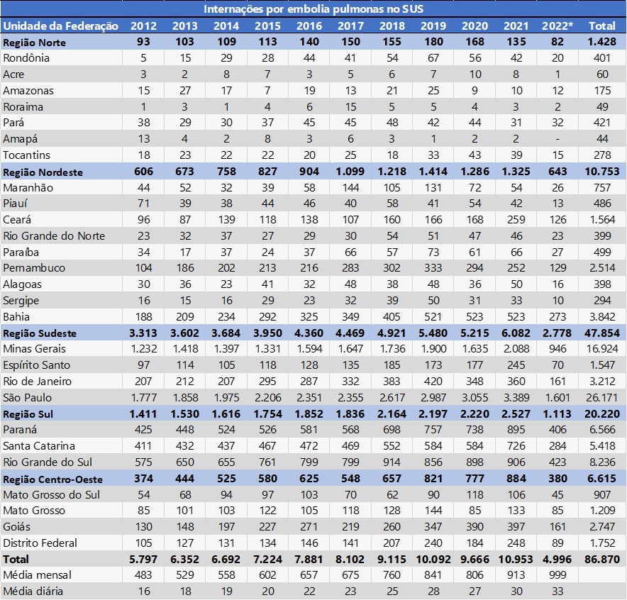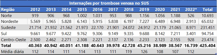 Um levantamento inédito realizado pela Sociedade Brasileira de Angiologia e de Cirurgia Vascular (SBACV), aponta que mais de 425 mil brasileiros foram internados para tratamento de tromboses venosas entre janeiro de 2012 e maio de 2022.