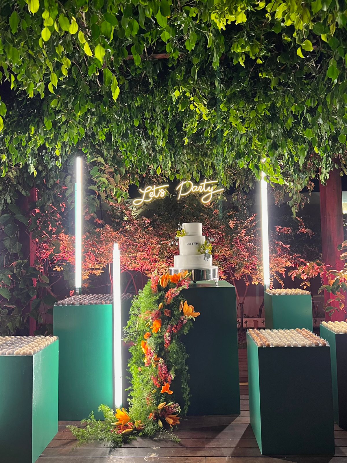 A decoração do evento ficou a cargo da renomada decoradora Georgia Bianka. A festa tinha um bolo branco muitas folhas e flores.