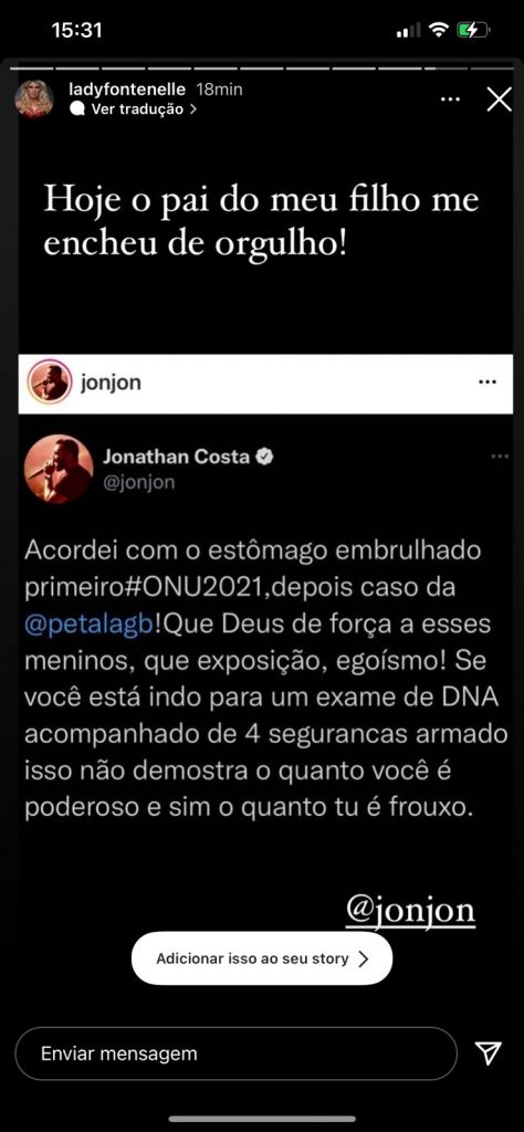 Ele postou em seus stories a seguinte frase: “Acordei com o estomago embrulhado, primeiro #ONU2021, depois caso da @petalagb! Que Deus de força a esses meninos, que exposição, egoísmo! Se você está indo para um exame de DNA acompanhado de 4 seguranças armado isso não demonstra o quanto você é poderoso e sim o quanto tu é frouxo”.