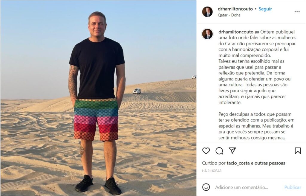Depois de ser criticado por um post no Instagram em que sugeria que as mulheres do Catar, país sede da Copa do Mundo 2022, não precisavam gastar com cirurgias plásticas e que isso era “super negativo”, para ele que é especialista em harmonização corporal, Dr. Hamilton Couto, voltou à rede social para se desculpar. Em novo post, ele destacou que ““talvez eu tenha escolhido mal as palavras que usei para passar a reflexão que pretendia”.