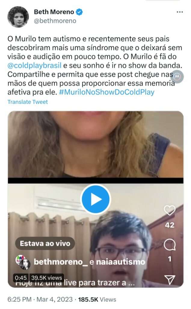 A jornalista Beth Moreno, também muito comovida pela história de Murilo, utilizou a sua conta oficial no twitter para pedir aos seus seguidores que marcassem a conta oficial da banda no Brasil para que eles pudessem conhecer Murilo. No tweet em questão, Beth divulgou um trecho da live onde Murilo aparece cantando “Magic”, um dos hits de Coldplay.