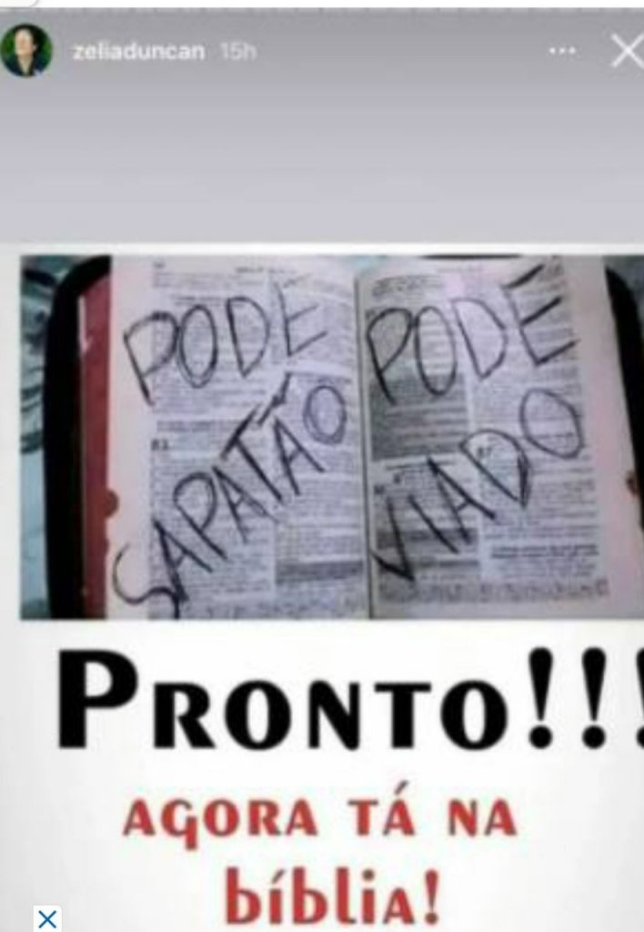 O print mostra a foto de uma bíblia rabiscada escrito: “Pode sapatão, pode viado”. Zélia postou e escreveu ao lado “Pronto!!! Agora está na bíblia”. Nas redes sociais, as pessoas começaram a acusá-la de ter rabiscado o item sagrado, mas ela disse que tudo aquilo era uma loucura porque ela nunca rabiscou nenhuma bíblia.
