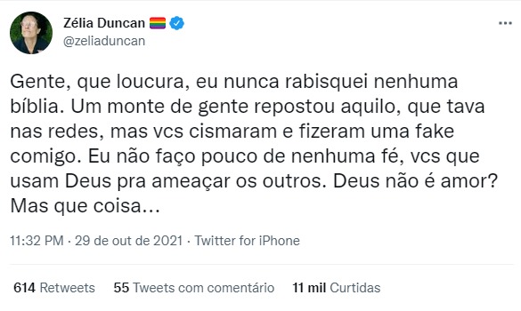 Nesta última semana, Zélia Duncan foi alvo de duras críticas após um print dos stories do Instagram dela viralizar na internet. Na imagem tinha uma bíblia rabiscada, mas no Twitter, a atriz afirmou que nunca fez isso e que a imagem era de uma pessoa desconhecida.