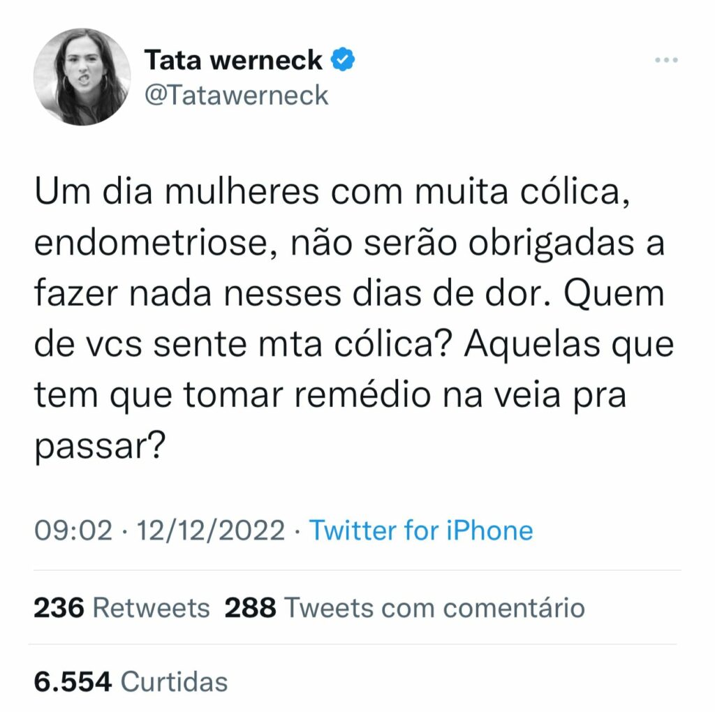 A humorista, apresentadora e atriz Tatá Werneck utilizou o twitter para conversar com suas seguidoras sobre cólicas fortes e endometriose. Em sua rede social escreveu: “Um dia, mulheres com muita cólica, endometriose, não serão obrigadas a fazer nada nesses dias de dor. Quem de vcs sente muita cólica? Aquelas que tem que tomar remédio na veia pra passar?”, questionou.
