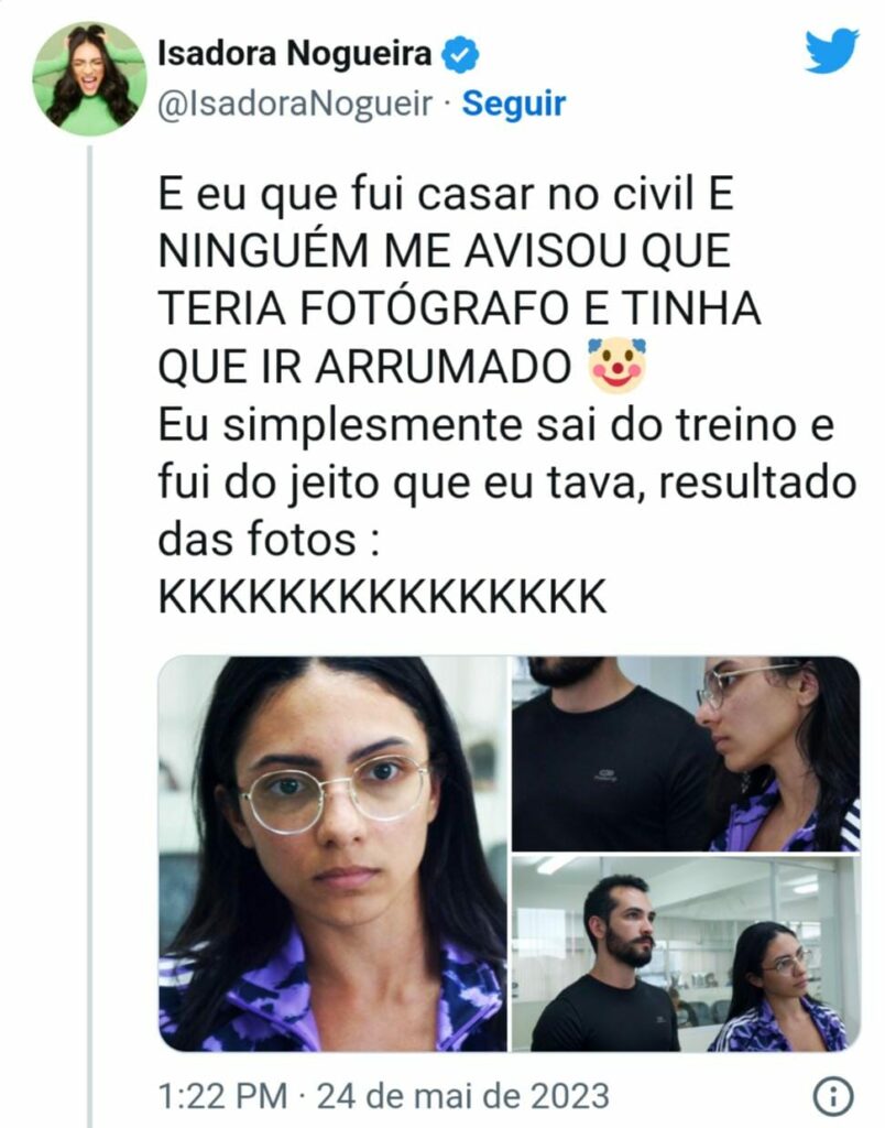 O vídeo compartilhado por Isadora alcançou mais de 3,5 milhões de visualizações no Instagram e o post com as fotos no Twitter chegou a 4 milhões de visualizações. A influenciadora conta que não fazia ideia de que ele teria tanta repercussão. “Quando eu postei as fotos eu não imaginava que daria tanta repercussão. Na verdade eu nem ia postar e nem ia ficar com essas fotos. As fotos foram um presente de casamento da minha sogra e do meu sogro porque quando a gente tava no cartório a gente falou ‘Não vamos querer foto, olha como a gente tá vestido’, mas aí a minha sogra acabou comprando pra fazer uma surpresa pra gente. E aí como ela já tinha comprado mesmo eu pensei: ‘Quer saber, vou postar e pelo menos vou rir dessa situação com meus seguidores’. Mas aí foi um boom que eu realmente não esperava”, revela.