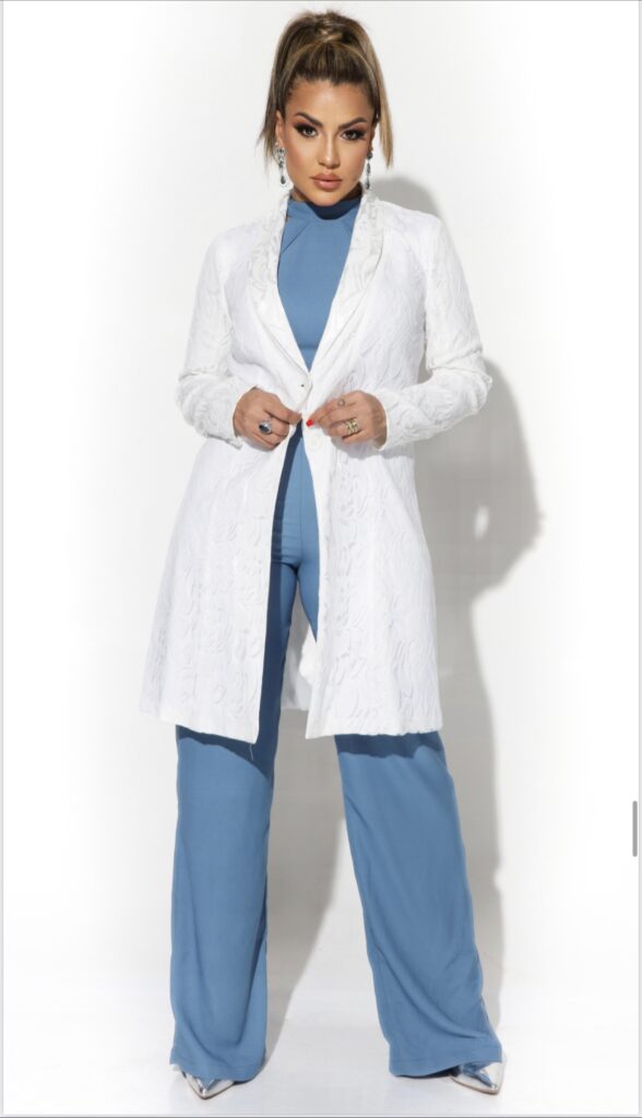 O sucesso das roupas rendeu o lançamento de mais uma coleção, mas desta vez, voltado para mulheres profissionais da saúde. “Junto com ela veio minha primeira linha de jalecos de alta costura. A gente vê jalecos chiques, bonitos, mas os jalecos de alta costura tem até Swarovski em alguns modelos das peças. Resolvemos lançar alguns jalecos, já que faço biomedicina e seria até mais um look de trabalho pra mim. Lançamos seis jalecos de alta costura. Fizemos o desfile e foi um sucesso. Várias médicas e empresárias estiveram no evento e acabaram usando as peças e aí nós resolvemos lançar a marca Duda Rodrigues”, diz a apresentadora.