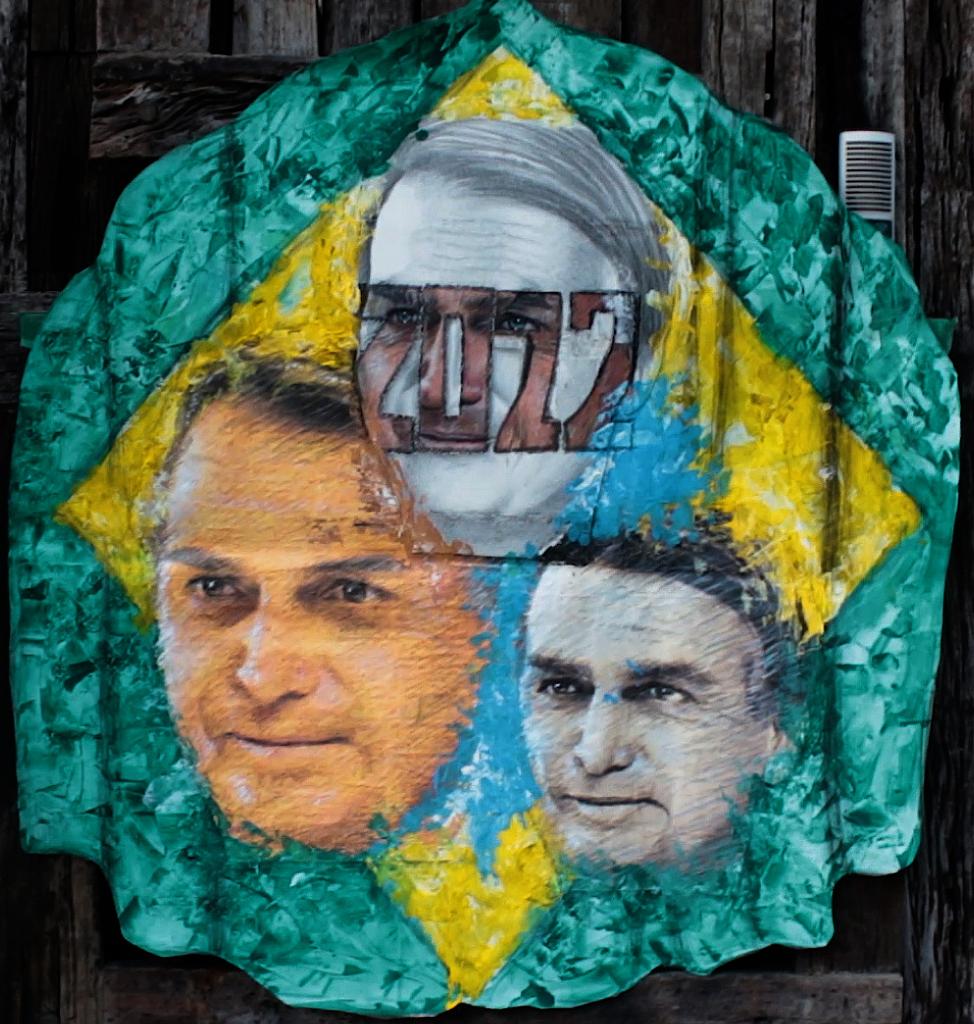 Em primeiro lugar, o artista fez o atual presidente, Jair Bolsonaro, seguindo as técnicas da escola expressionista alemã, de forma mais livre, portanto. Ele está sob uma bandeira do Brasil desfraldada e três faces com diferentes expressões que significam a visão que ele tem do país em três formas diferentes.