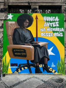 - Arte de graffiti “Ministra Negra” segue presente no muro lateral do Cordão do Bola Preta, na Lapa, no Rio de Janeiro.