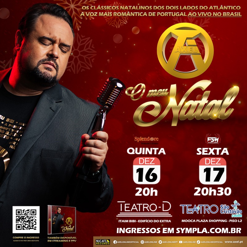 Após o sucesso do especial de Natal, “Meu Natal”, gravado nos estúdios ST4 em Jandira e disponível em Pay Per View Online em todo o mundo, o cantor Axel agora está em turnê com o espetáculo. Sua primeira parada será em São Paulo, nos próximos dias 16 e 17.