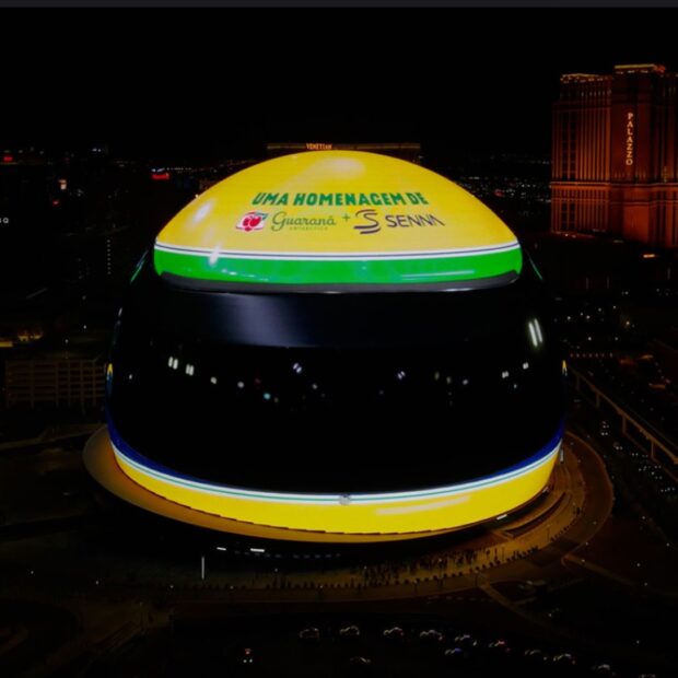 Ayrton Senna foi homenageado pelo Guaraná Antarctica com referência a seu capacete histórico. A marca celebrou os 30 anos da morte do ídolo nacional com projeção na maior estrutura esférica do mundo, em Las Vegas (EUA), para amplificar pelo planeta a memória do maior piloto brasileiro de todos os tempos. Nesta quarta-feira, dia 1º, uma animação de LED gigantesca simulando o capacete de Senna na imponente Sphere despertou a emoção entre os fãs do ídolo mundial.
