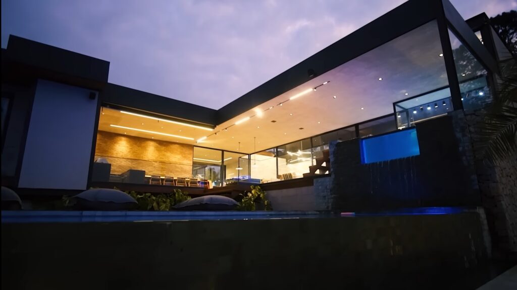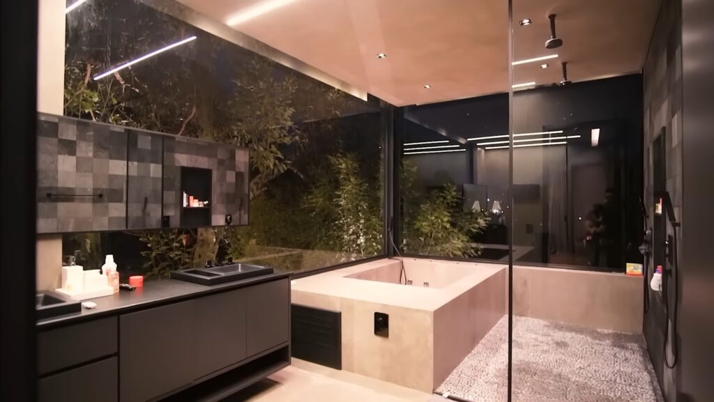 A primeira casa adquirida pela influenciadora conta com 4 suítes, uma delas a suíte máster com uma vista panorâmica proporcionada pelas janelas de vidro que miram diretamente para uma área de vegetação.