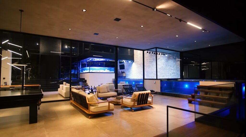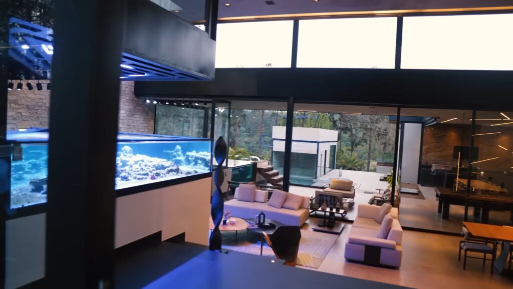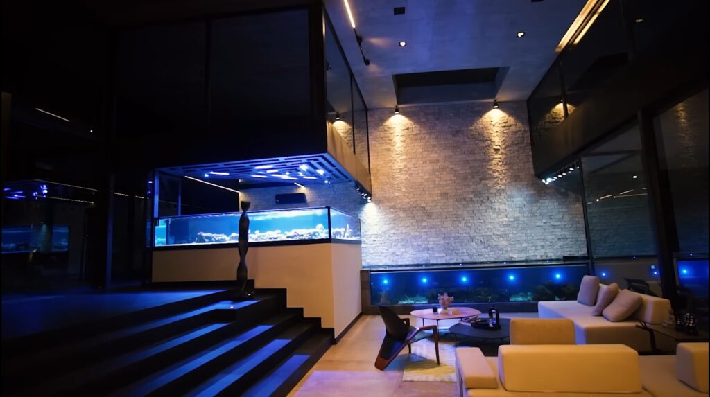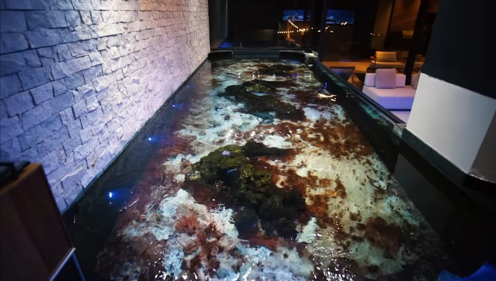 O destaque vai para seus aquários de água salgada. Um deles com corais e outro com três tubarões. Uma estrutura impressionante que conta com água reciclada 24h e um sistema próprio e independente de filtragem e abastecimento elétrico.