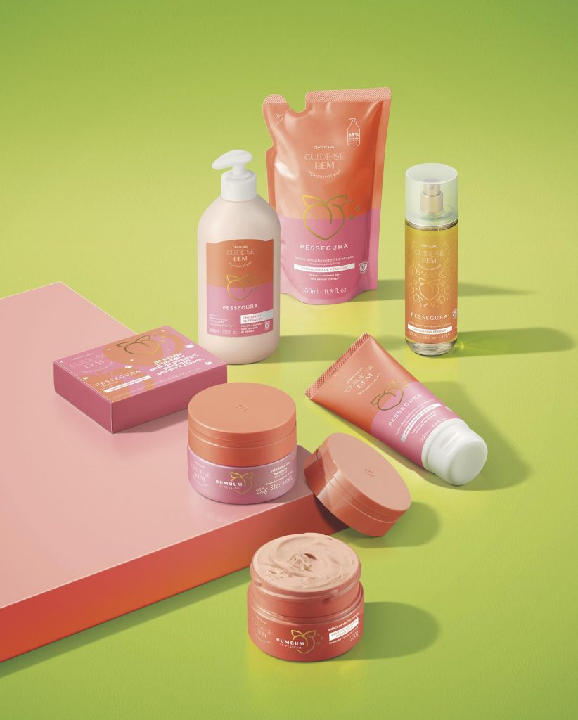 A linha Cuide-se Bem Pessegura traz produtos de cuidados com o corpo, tendo opções de loções hidratantes, body splash e sabonete em barra. E como destaque do lançamento, dois produtos Bumbum de Pêssego para os cuidados específicos da pele do bumbum: máscara de hidratação e esfoliante, com ativos potentes de tratamento, que são o ácido salicílico e a niacinamida. Todos os produtos têm fragrância de pêssego, são veganos, cruelty free e contam com mais de 90% de ingredientes naturais em suas fórmulas.