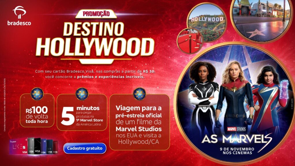 A promoção “Destino Hollywood”, é uma parceria entre o Bradesco e a Visa que está fazendo os corações dos fãs da Marvel baterem mais forte. Nesta terceira e última fase da promoção, os clientes Bradesco portadores de cartões Visa têm a chance de participar de uma pré-estreia oficial da Marvel Studios nos Estados Unidos em 2024.