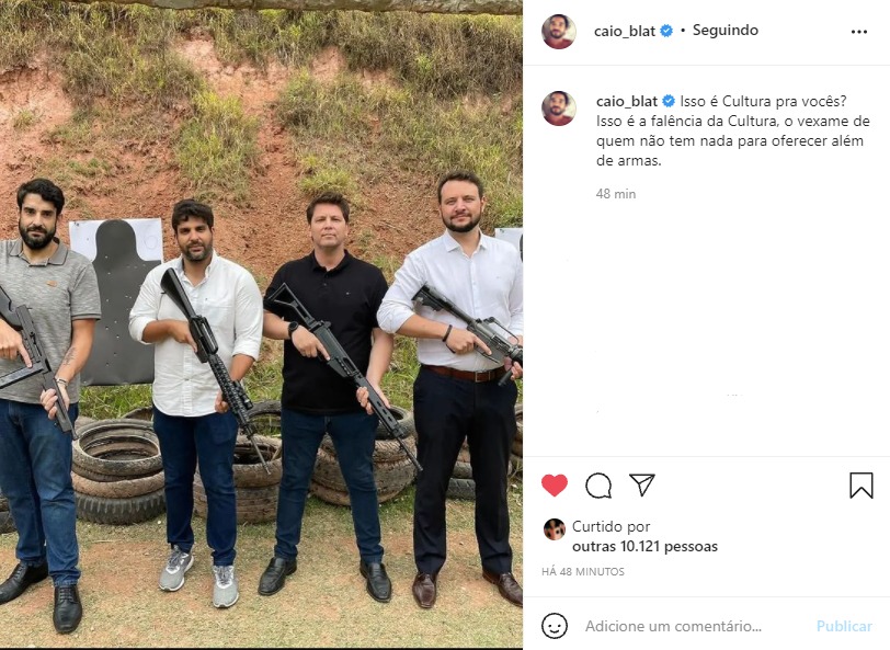 O ator Caio Blat, de 41 anos, postou uma foto, em seu perfil no Instagram, do atual secretário segurando uma arma e criticou a postura: “Isso é Cultura pra vocês? Isso é a falência da Cultura, o vexame de quem não tem nada para oferecer além de armas.”, escreveu na legenda.