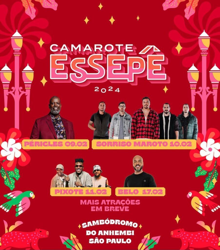 Localizado ao longo da avenida do samba, o Camarote Essepê contará com shows de renomados artistas da música nacional, com Belo, Péricles, Sorriso Maroto e Pixote já confirmados como atrações. Os visitantes poderão desfrutar de um serviço all inclusive, que inclui open bar premium e open food, em parceria com alguns dos restaurantes mais conceituados da cidade.