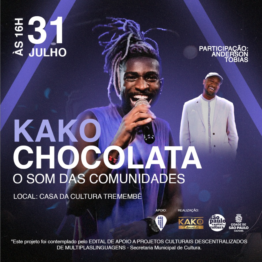Considerados “ícones” do Samba, na Zona Leste de São Paulo, Kako Chocolata e Banda, além do convidado, Anderson Tobias, compõem a programação da Casa de Cultura do Tremembé, na Zona Norte da cidade.