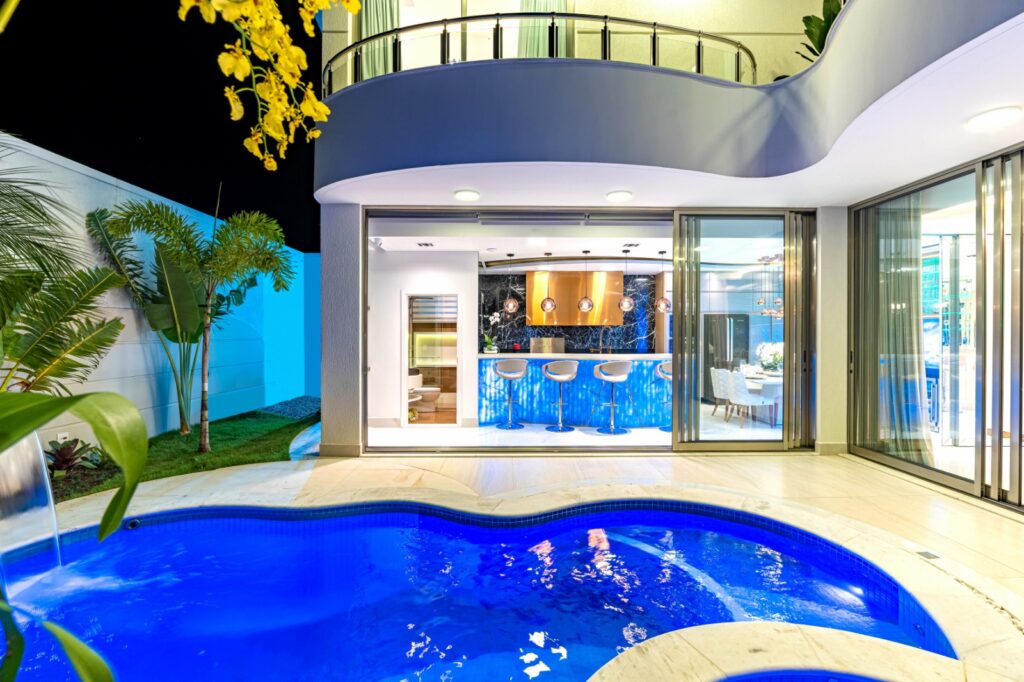 Na mesma área, há uma pequena grelha e uma churrasqueira à carvão embutida, além de uma TV articulada que atende às áreas da cozinha e da piscina. Da bancada da pia é possível contemplar toda o espaço. Além disso, uma das pedras naturais escolhidas em fundo azul garantem um charme a mais ao ambiente, e valoriza o azul da piscina, que fica logo ao lado.