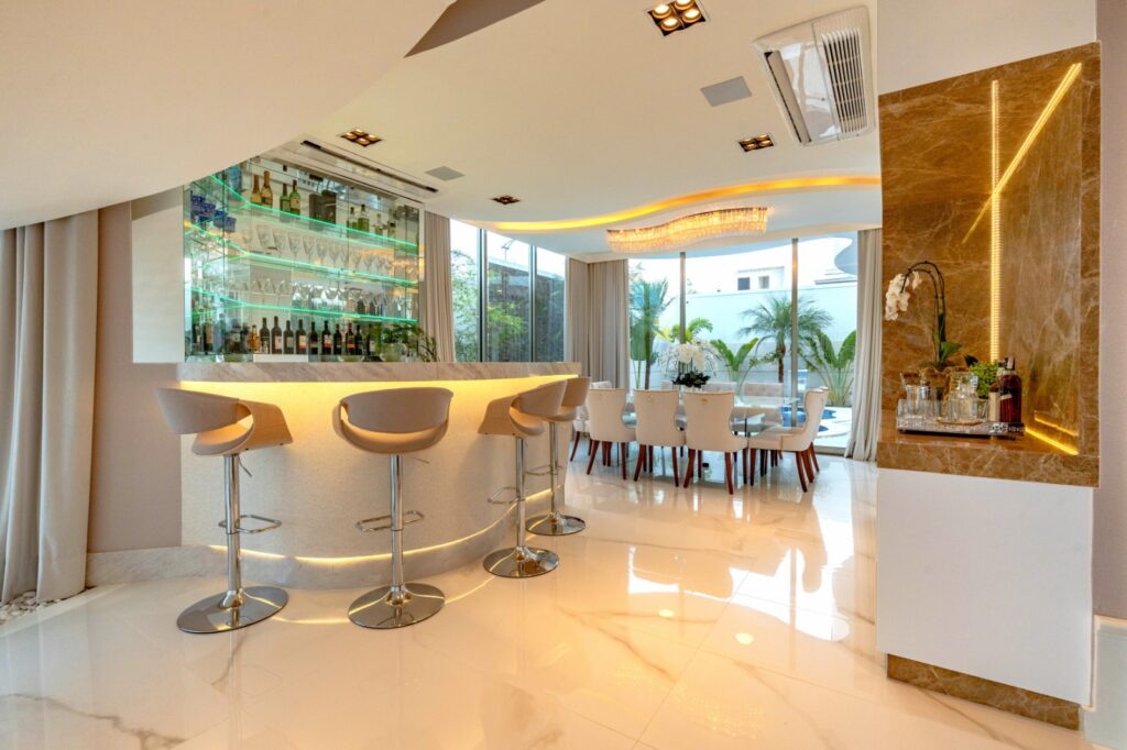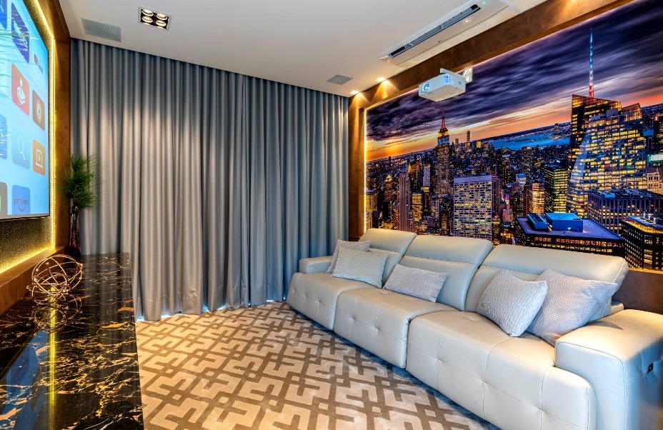 Na transição do living para a sala do jantar há um bar que foi construído como uma proposta para receber os amigos antes das refeições. No centro da casa, uma porta espelhada conduz até uma sala de cinema com a cidade de Manhattan ao fundo, em papel de parede.
