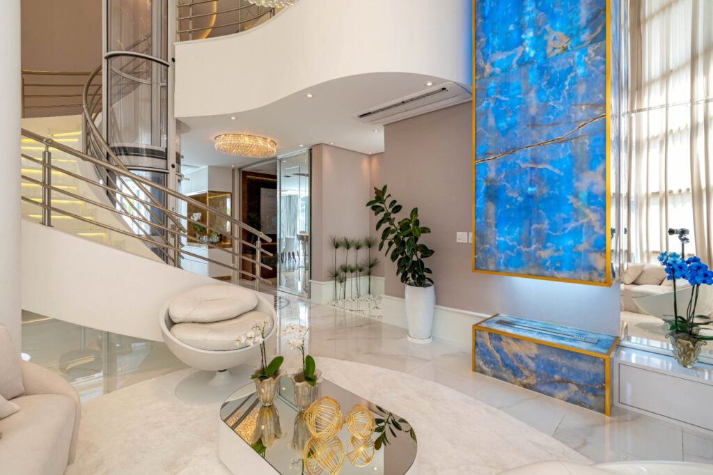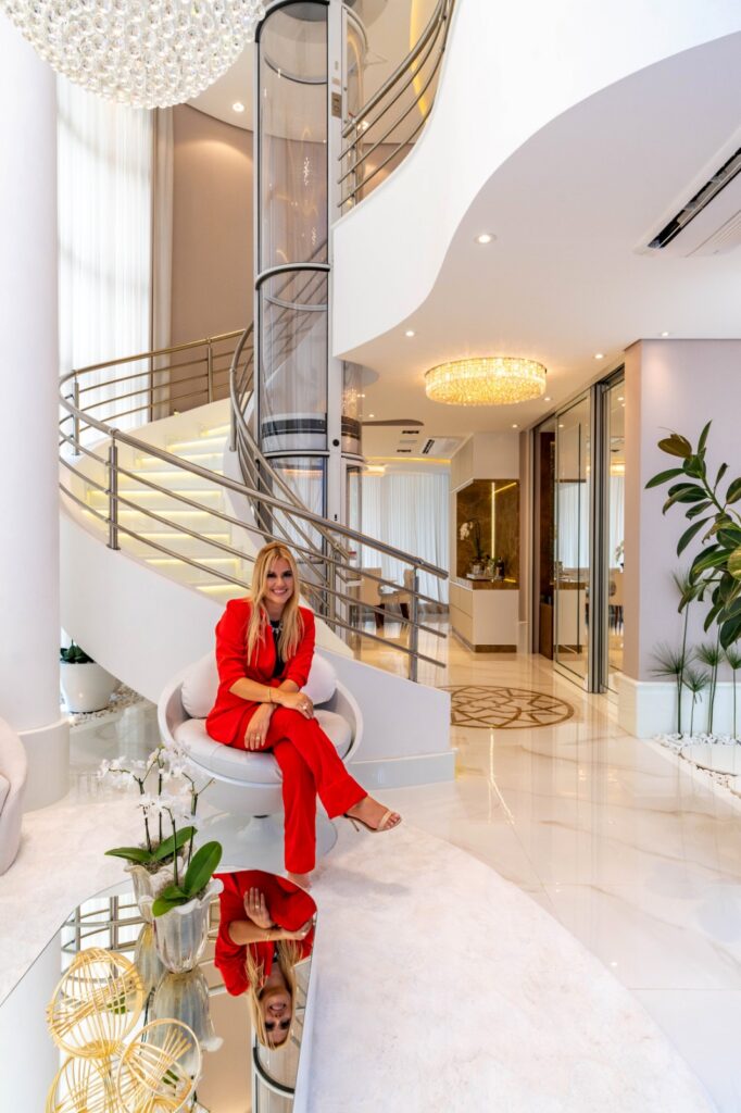 Iara Kílaris conduz os internautas a um passeio pela deslumbrante ‘Casa Luz’, que foi construída em um terreno de esquina com formato curvo com detalhes em contracurva. Já no interior, os móveis e os lustres da sala seguiram o formato curvo. A pedra exclusiva da lareira sobe até o teto e entrega muita elegância e uma beleza única. A integração entre os ambientes se estende na escada e elevador, proporcionando um resultado bonito e moderno.