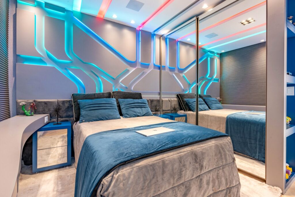 O próximo quarto é o gamer, com efeito de luzes e bastante interação. Com detalhes surpreendentes que remetem a uma balada com jogos de luzes que podem mudar de cor ou fixar em uma mesma cor, o quarto é cheio de detalhes e nichos que compõem um quarto de menino. A porta para o banheiro é quase uma passagem secreta e no interior, mais uma pedra exclusiva e detalhes luxuosos.