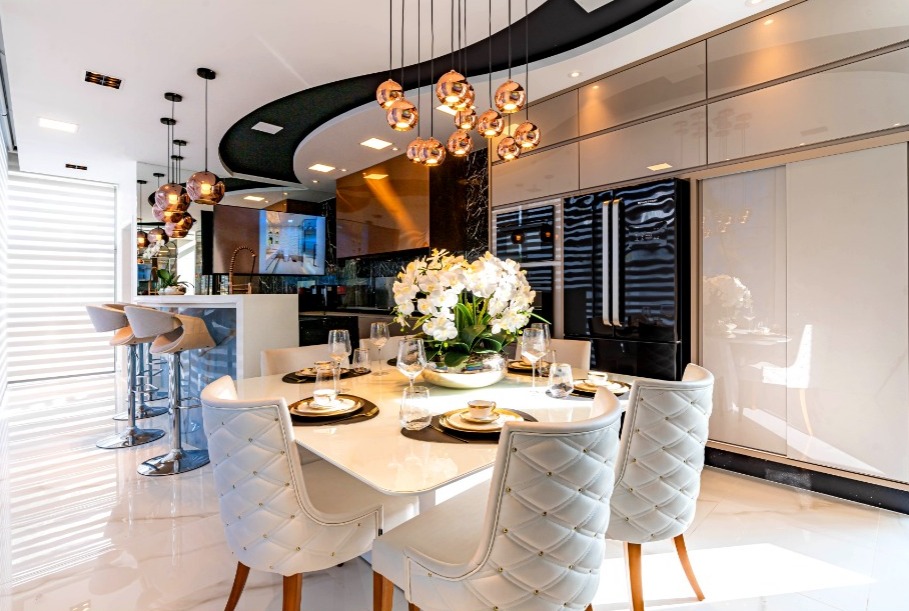 Depois da moderna sala de TV, um lavabo que ao abrir a porta, começa a tocar uma música. Já dentro dele, um vaso suspenso e uma bancada em curva com pendentes. Para garantir mais espaço, a área gourmet e a cozinha foram integradas em um só espaço. A mesa das refeições é a própria mesa da área. As cervejeiras permitem que os convidados possam pegar suas bebidas sem precisar ficar abrindo a geladeira da casa, o que garante mais conforto e privacidade.