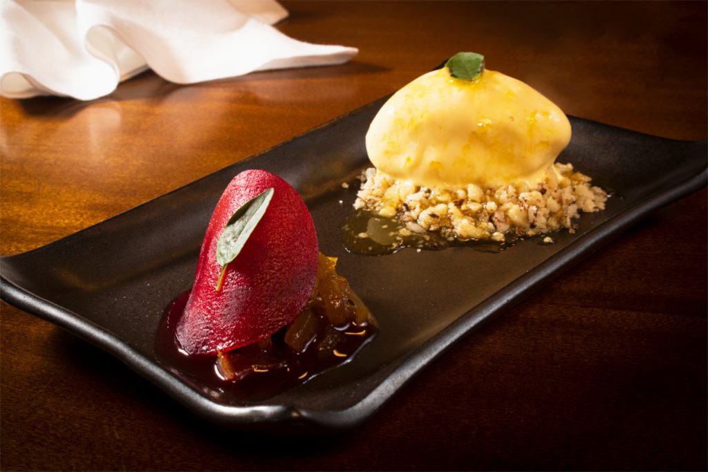 para um prato autoral e refrescante, o Ravióli de Beterraba com Chutney de Pera, Sorvete de Mostarda e