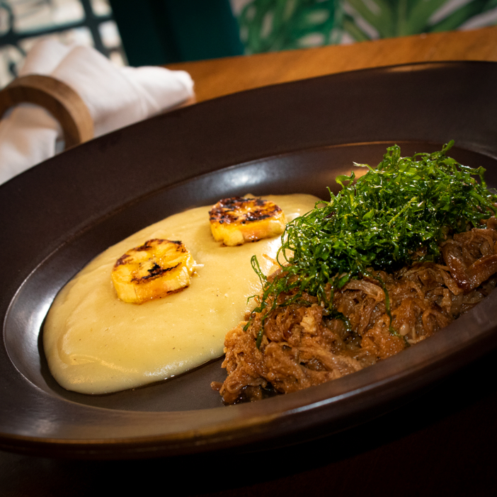 Costela Desfiada Cremosa com Purê de Batatas, Couve Crocante e Banana da Terra bx