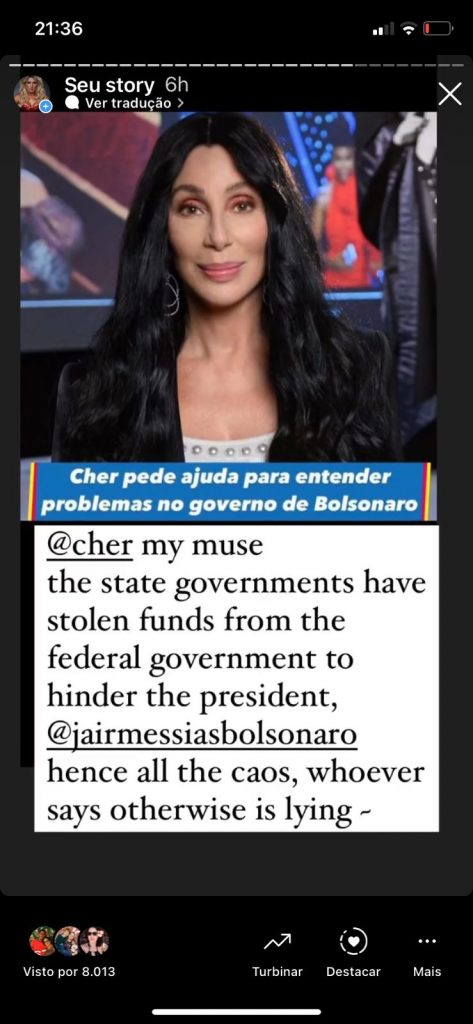 Fontenelle a respondeu no domingo (24), através de seu Instagram (@ladyfontenelle), postando uma foto da cantora com os seguintes dizeres: “@cher minha musa, os governos estaduais roubaram fundos do governo federal para atrapalhar o presidente Bolsonaro daí todo o caos, quem disser o contrário está mentindo”, disparou.