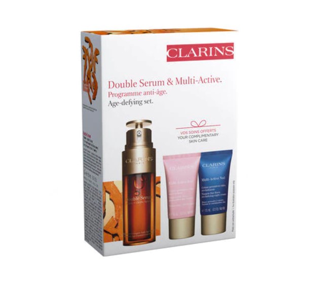 Double serum Clarins, kit com o sérum e dois hidratantes. Créditos: Reprodução/Site Sephora.