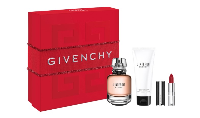 L’Interdit Givenchy, kit promocional com o perfume em tamanho grande, uma loção corporal e um batom. Créditos: Reprodução/Site Sephora.