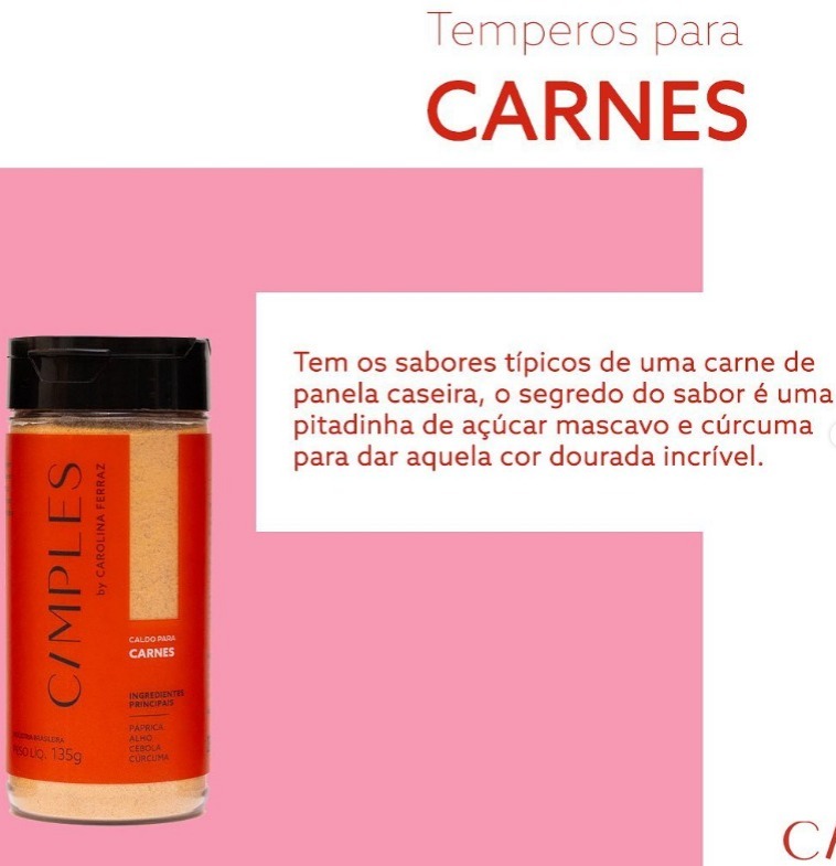 · Carnes: tem os sabores típicos de uma preparação de carne de panela caseira, ou seja, alho, cebola, cominho, louro e páprica. Possui uma leve picância, mas muito bem balanceado para trazer cor e sabor a carnes cozidas ou assadas em fogo baixo. O segredo é uma pitadinha de açúcar mascavo e cúrcuma para dar uma cor dourada incrível. Preço: R$ 19,90.