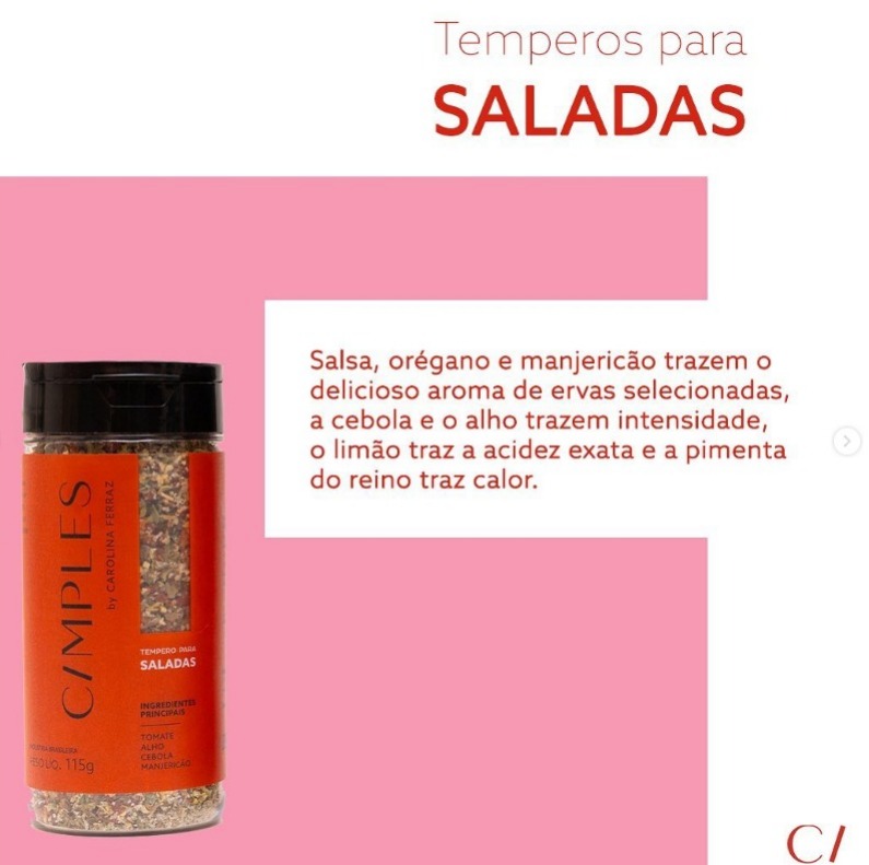 · Saladas: salsa, orégano e manjericão trazem um delicioso aroma de ervas selecionadas; a cebola e o alho trazem intensidade; o limão a acidez exata; e a pimenta do reino o calor. Pode ser usado para temperar saladas, legumes, ovos, massas, pizzas, molhos, entre outros. A assinatura do sabor é o tomate desidratado, que traz doçura, além de dar um toque de cozinha italiana. Preço: R$ 16,50.