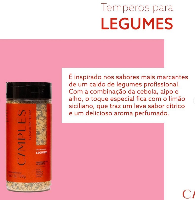 · Legumes: inspirado nos sabores mais marcantes de um caldo de legumes profissional. Composto por cebola, aipo e alho, é ideal para preparar legumes, sopas, vegetais, peixes e caldos. Pode ser usado também para temperar maioneses e massas, preparar molhos e dar um toque especial no arroz do dia a dia. O diferencial é o limão siciliano em pó, que traz um leve sabor cítrico e um delicioso aroma perfumado. Preço: R$ 19,90.