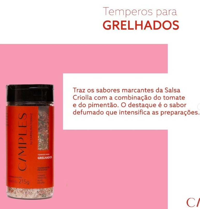 · Grelhados: lembra o famoso sal de parrilla, que é usado principalmente na Argentina. Traz os sabores marcantes da Salsa Criolla, combinada com tomate e pimentão. É ideal para preparar sanduíches, peixes e carnes e vegetais grelhados em fogo alto, assados no forno ou salteados em frigideira. Também pode ser usado como substituto do sal grosso em churrascos. O destaque é o sabor defumado, que intensifica as preparações. Preço: R$ 16,50.