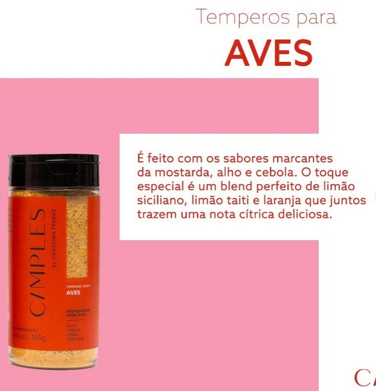 · Aves: é feito com os sabores marcantes da mostarda, alho e cebola, com um toque de açúcar mascavo e cúrcuma, para dar a cor dourada perfeita aos grelhados, assados, cozidos ou salteados. Além disso, traz a combinação incrível de páprica e pimentas do reino branca e preta, proporcionando calor ao paladar e aroma ao prato. O toque especial é um blend de limão siciliano, limão taiti e laranja, que juntos trazem uma nota cítrica deliciosa. Preço: 19,90.