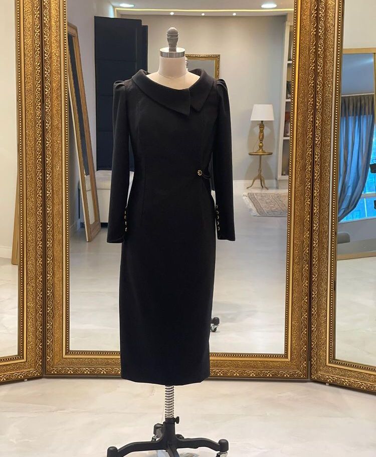 E continua: “Já sabido do frio londrino, optamos por um vestido midi em lã italiana, com detalhes como a gola em alfaiataria inglesa, o martingale em rolotê (técnica clássica usada em nosso ateliê), e os discretos botões que homenageiam o Reino Unido. Agradecemos o reconhecimento, carinho e preferência pelo nosso trabalho. Este vestido, um presente a ela, foi criado e confeccionado por nós, exclusivamente para o evento”.