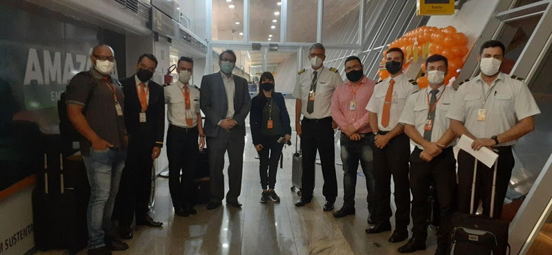 A tripulação que operou o voo de retorno da Gol para Paramaribo, no domingo (9/01), junto ao executivo e a equipe da Gol no aeroporto de Belém