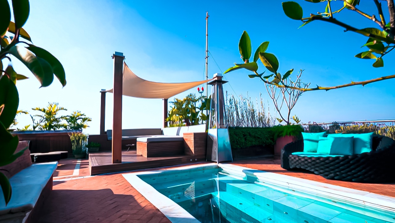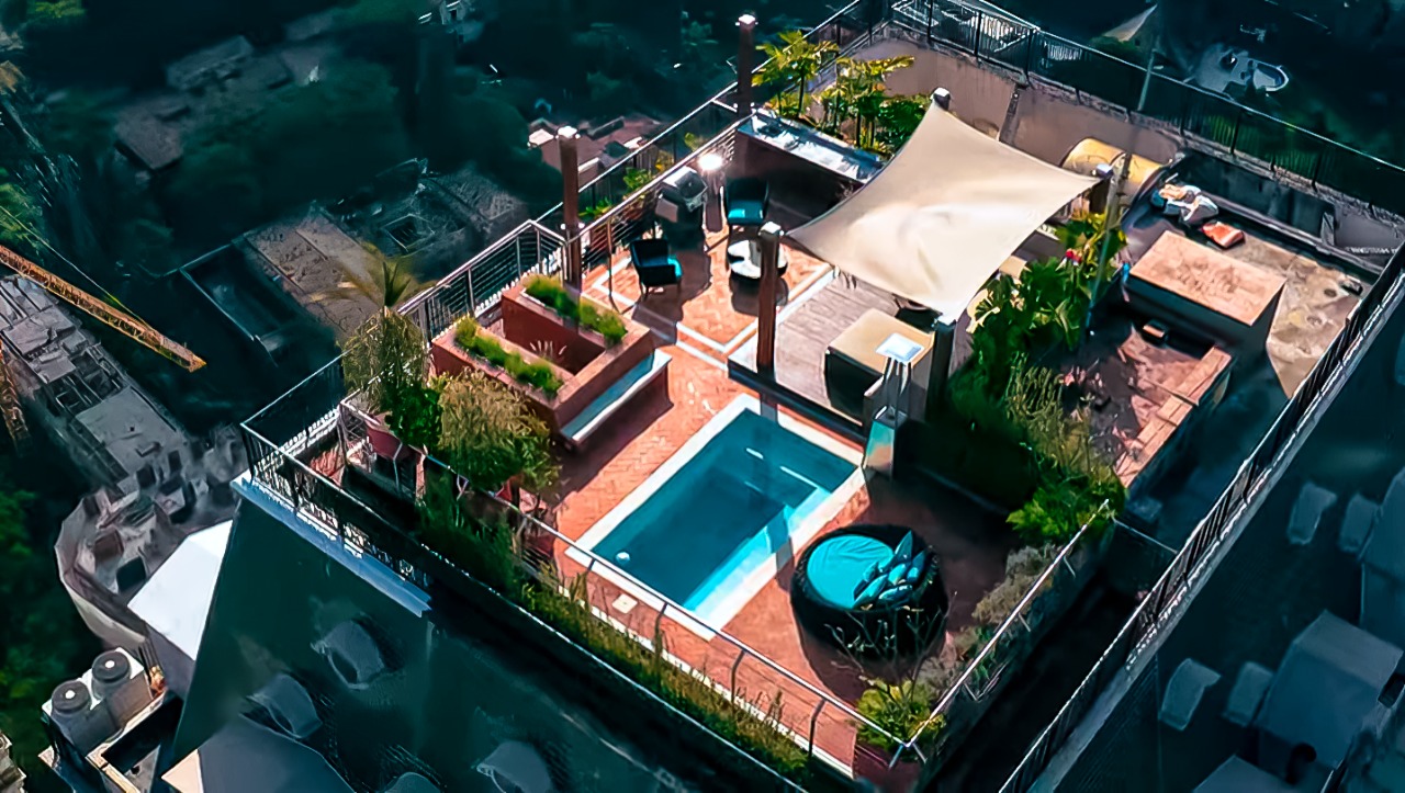 Para o apartamento ficar ainda mais encantador, também houve mudanças na cobertura do apartamento. Agora o espaço conta com um banco estofado próximo a um fogareiro, depois há uma churrasqueira com uma mesa de centro e algumas cadeiras, e para finalizar tem também a piscina com um lindo paisagismo.