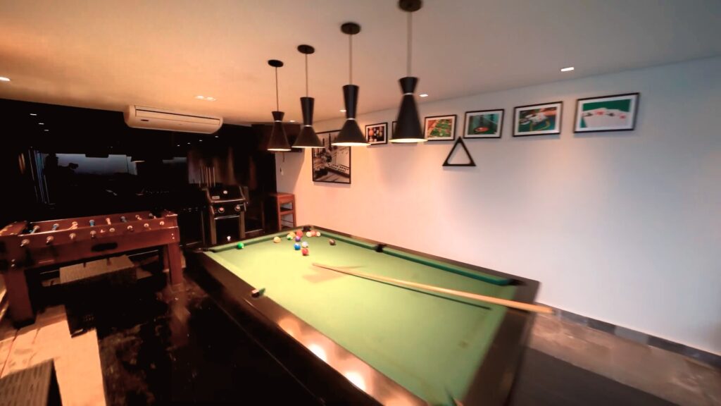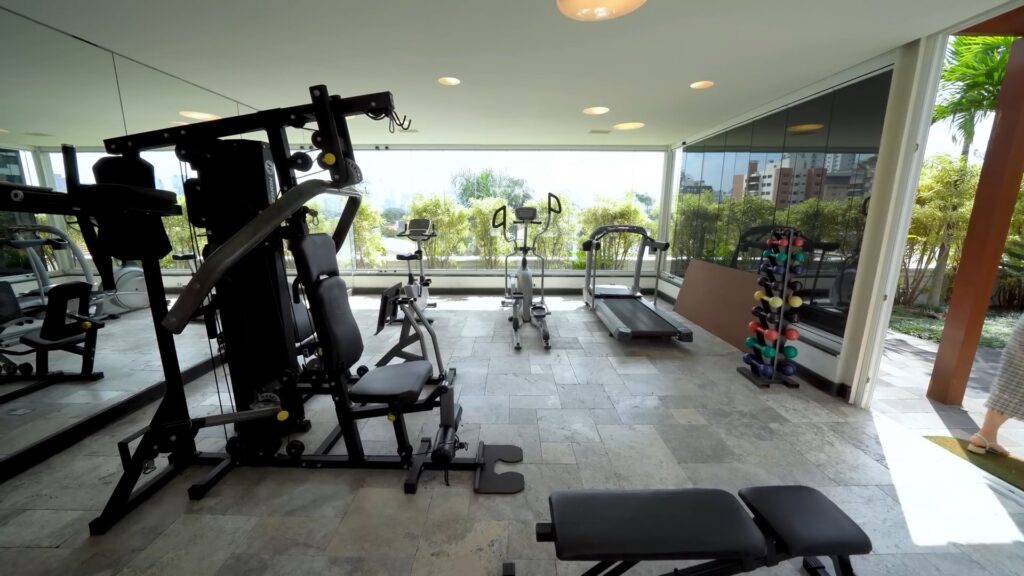 E se o assunto é diversão, tem mais! No subsolo há um bar com espaço para boate para receber mais de 100 pessoas e palco para shows, além de um telão. Tudo isso cercado por portas à prova de som. Para os que não dispensam uma boa malhação, uma academia completa foi montada no local, assim como uma sala de jogos para ampliar o entretenimento.
