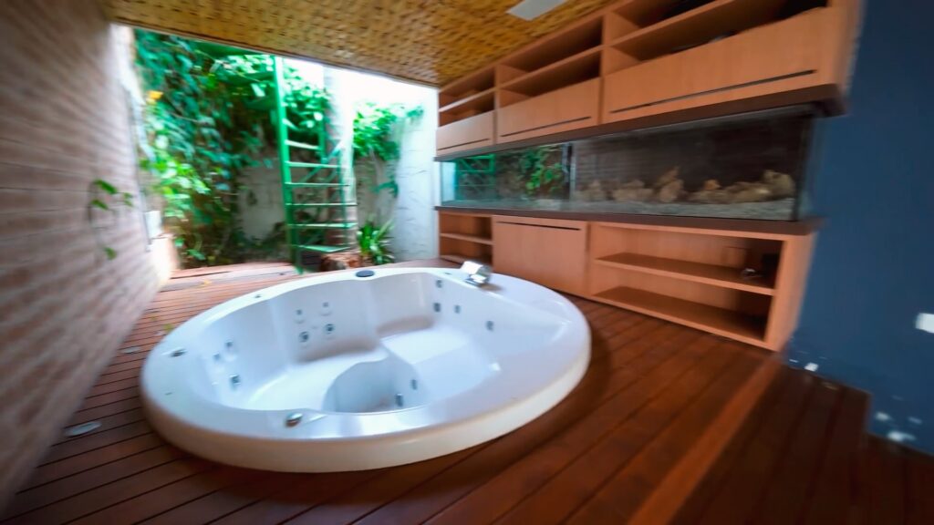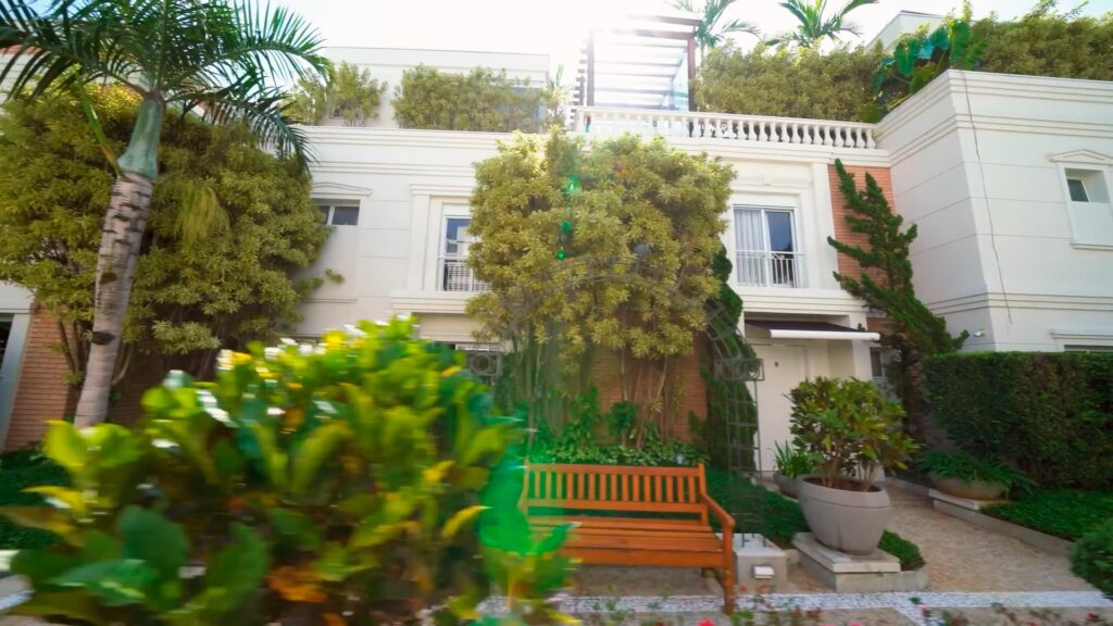 A tecnologia também está presente. Na garagem para 7 carros, há portas blindadas. Um sistema de segurança de alto padrão foi instalado em todo o imóvel, que também é sustentável, contando com 16.000 litros de água de reuso para irrigação do jardim, 32 placas fotovoltaicas e vários espaços decorados com madeira de demolição.